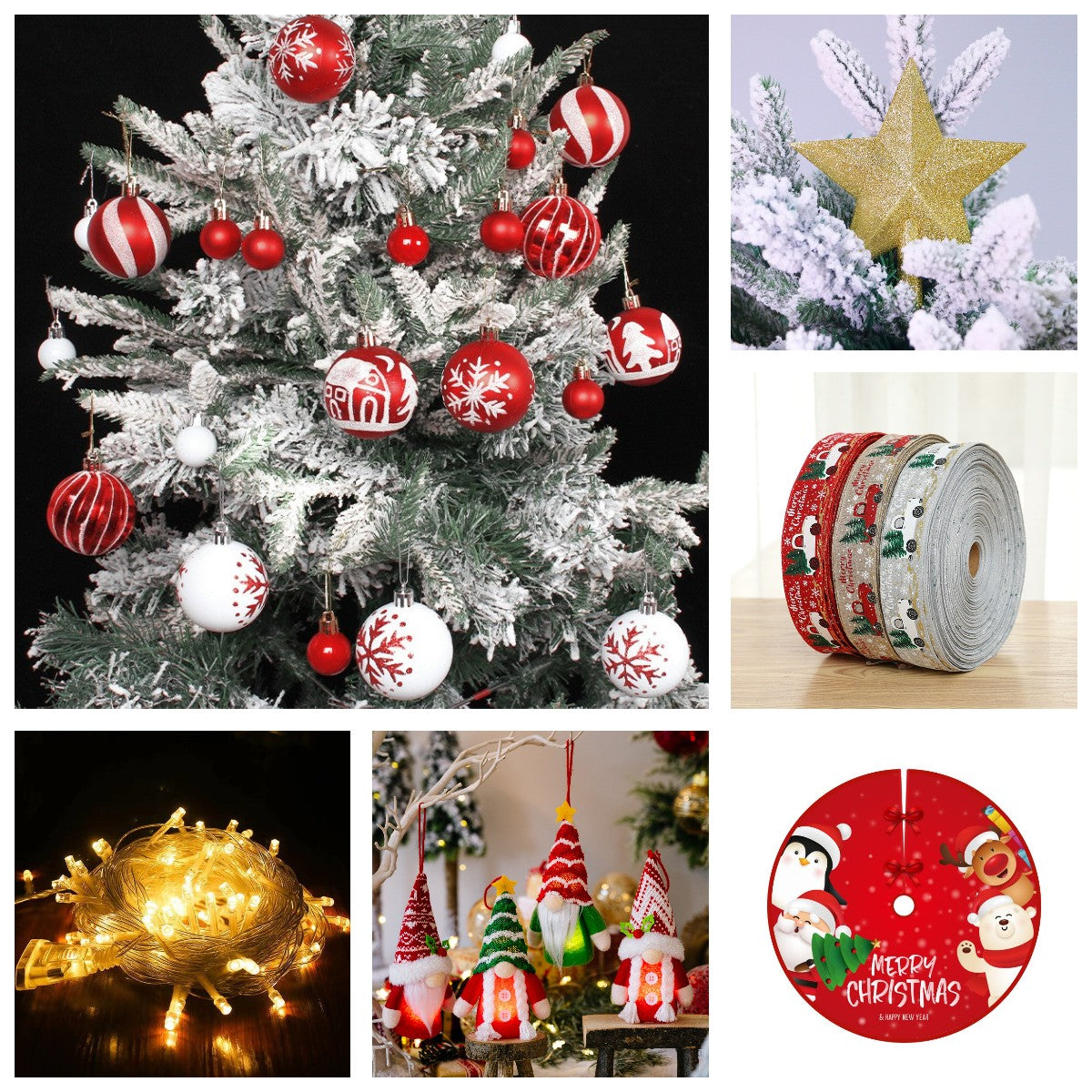 Package including:4pcs Gnome Hanging Ornaments(6"x2")+3*6.5ft Christmas tree decoration ribbons + 32ft string lights+35“ Christmas tree skirt+1pcs tree top+44pcs Christmas tree ball pendants